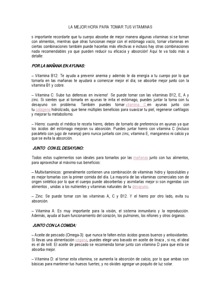 Las vitaminas se toman en ayunas. Ayuda a prevenir la anemia y brinda energía por lo que tomarla en las mañanas en ayunas es la mejor opción. Si existe un verdadero déficit de vitamina B12 debe compensarlo por via inyectable Consigue respuesta. De acuerdo con Mundo Deportivo estos son los beneficios que aporta la sábila a la salud si se.